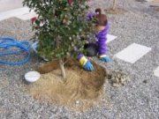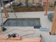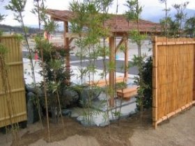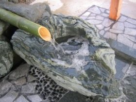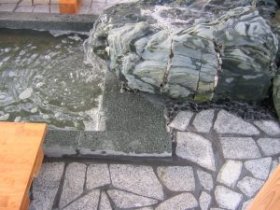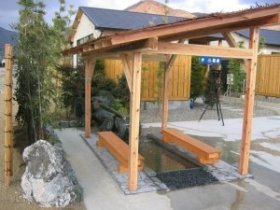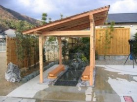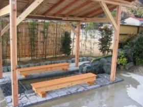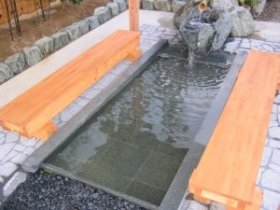 天然温泉が出る分譲地の一角に施工させて頂きました。気軽に足をつけていただけるように、6人座り用のベンチを設けました。青石のツクバイと竹を使用し、お湯の落ち方に気を配りました。