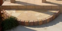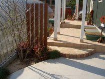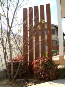 玄関前には、レンガ縁取りのパラストーンで半円のステップを1段設け、アクセントの門柱はウリン材を5本立て、その下は植栽スペースに致しました。