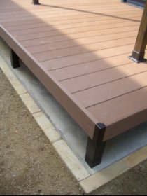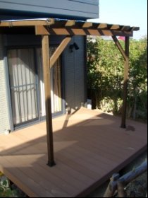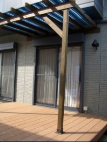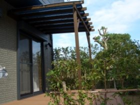 メンテナンスが少ない大きな木樹脂デッキとテラスを設置致しました。テラスには、オーダーメードの帆布を設置。鮮やかなブルーがとても綺麗です。
