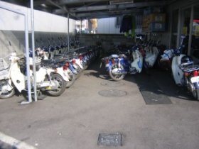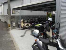 アスフェルトを土間コンに敷きかえをさせて頂きました。新聞販売店で、沢山のバイクを駐輪するため、まだ真新しいアスフェルトがスタンドでかなり削られてしまっていました。(ゴムを敷き、対処されていました)