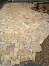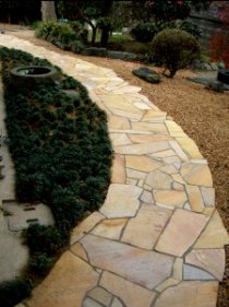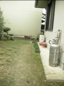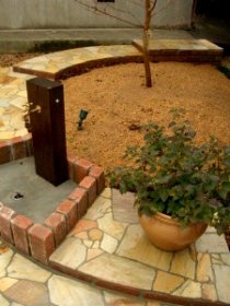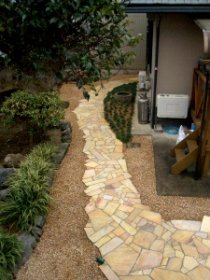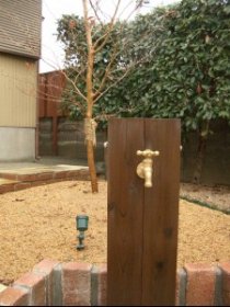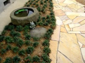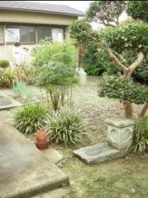 広がる自然石のフロアの奥にはシンボルツリーのヒメシャラ。それを囲うように配置した花台と立水栓は奥行き感を与えます。また、昔から庭の隅にあったという石臼を水鉢に使ったり、玉竜を移植して築山コーナーをつくったりと遊び心も満載です。夜にはライトアップがフロアを照らします。
