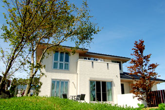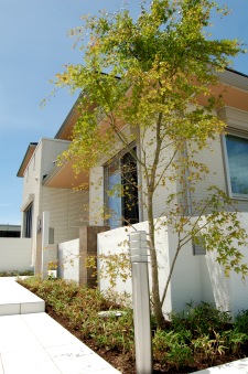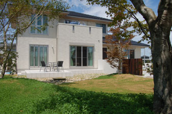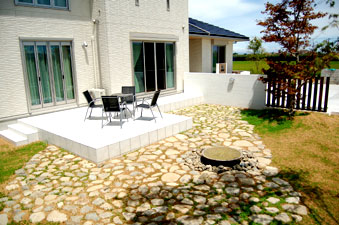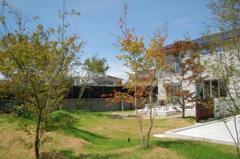 Y様邸は、アウトリビングガーデンを主体に広々とし、クローバーと吉野川砂岩を組み合わせモミジで溢れる庭としました。