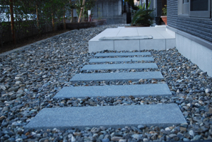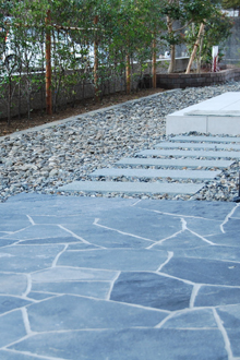玄関までのアプローチには天然石の乱型を敷き詰めました。