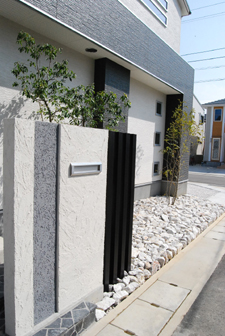 和室前の目隠しにルーバーフェンス、門柱横に角柱を